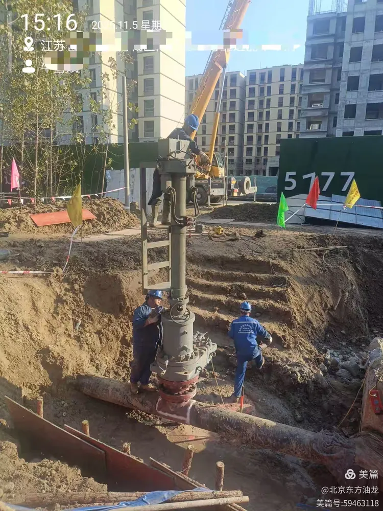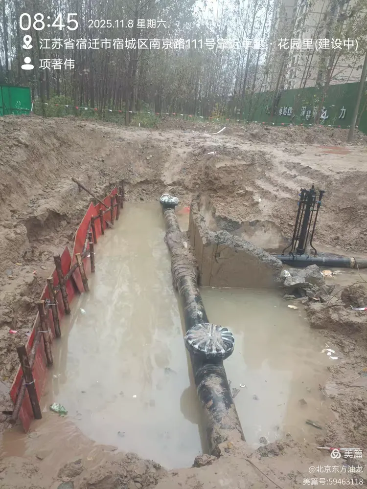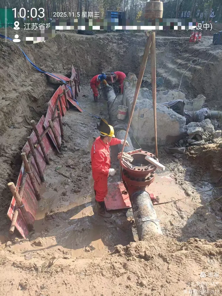 坑里的黑管静静躺着,表面磨损的痕迹像是岁月的勋章,而新装的阀门锃亮如初,像一枚崭新的勋章别在老兵的胸前。泥水糊了半截管道,可那接口处一丝不漏,稳得像焊进大地里。绿色围挡上的标识在雨后格外清晰,像在默默记录这一刻。杂乱是施工的常态,但在这片混乱中,我们完成了一件极其精密的事——江苏项目D355.6的第一处双封换阀,正式投运。