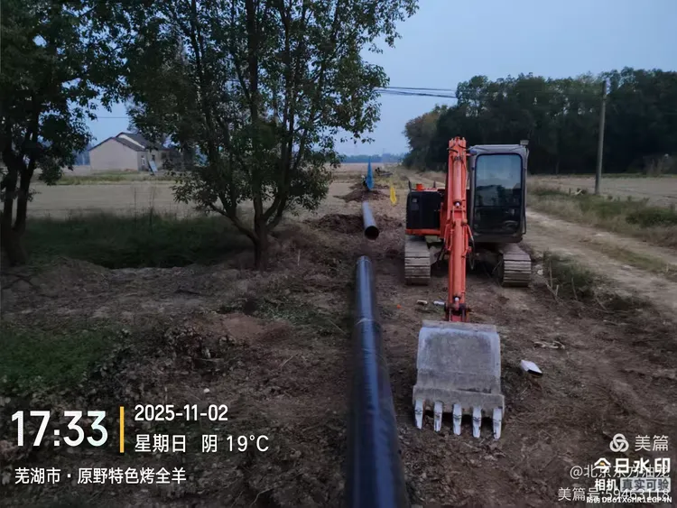 河对岸的桥影斜斜地映在水面上,我们的设备就架在岸边。橙色的挖机臂缓缓落下,将一段管道稳稳送入沟槽。河水静静流着,仿佛对这场入侵毫不在意。可我知道,每一寸施工都经过测算,不能扰动河床,也不能耽误工期。电线杆投下细长的影子,我站在桥头看了许久——这条黑蛇终将潜行于大地之下,而此刻,它正一寸寸苏醒。